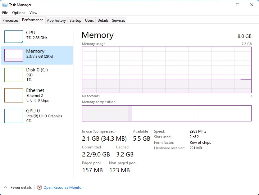 Внутри впаяно 8 ГБ памяти DDR4 2933 МГц, работающей в двухканальном режиме: