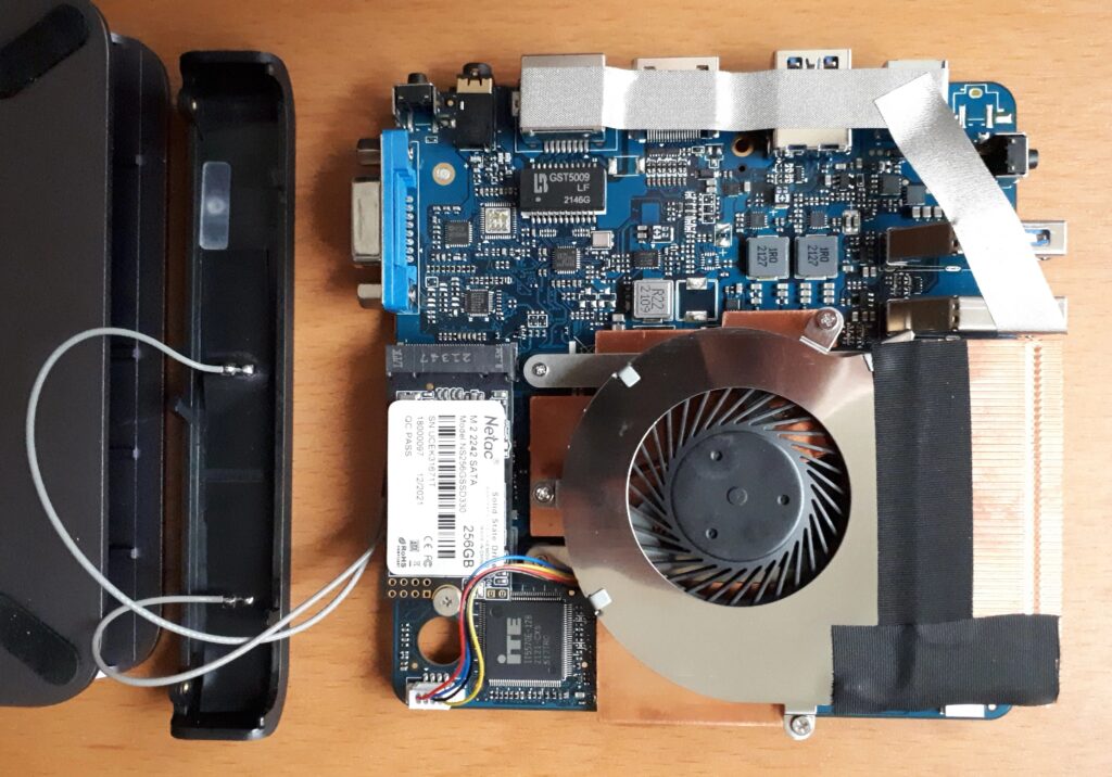 и припаянный чип Intel Wireless-AC 3165 вместе с диском M.2 2242 SATA (модель, представленная в обзоре включала диск Netac емкостью 256 ГБ в комплекте с установленной Windows 10 Pro), доступ к которому осуществляется путем снятия передней и задней панелей, а затем выдвижения материнская плата из алюминиевого корпуса: