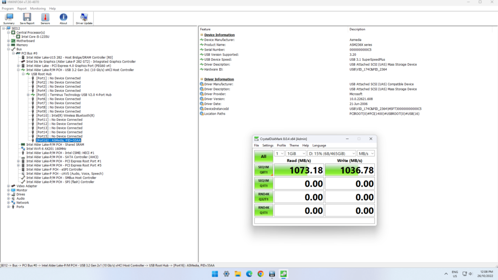 и перечисляет все порты USB как 3.0, поэтому мы протестировали их вместе с портом USB Type-C, используя твердотельный накопитель Samsung 980 PRO PCle 4.0 NVMe M.2, размещенный в «адаптере USB-M.2 NVMe» (ORICO M2PAC3-G20). Корпус твердотельного накопителя M.2 NVMe), который показал, что все «синие» USB-порты и USB-порт Type-C были USB 3.1 (USB 3.2 Gen 2×1, т. е. 10 Гбит/с):