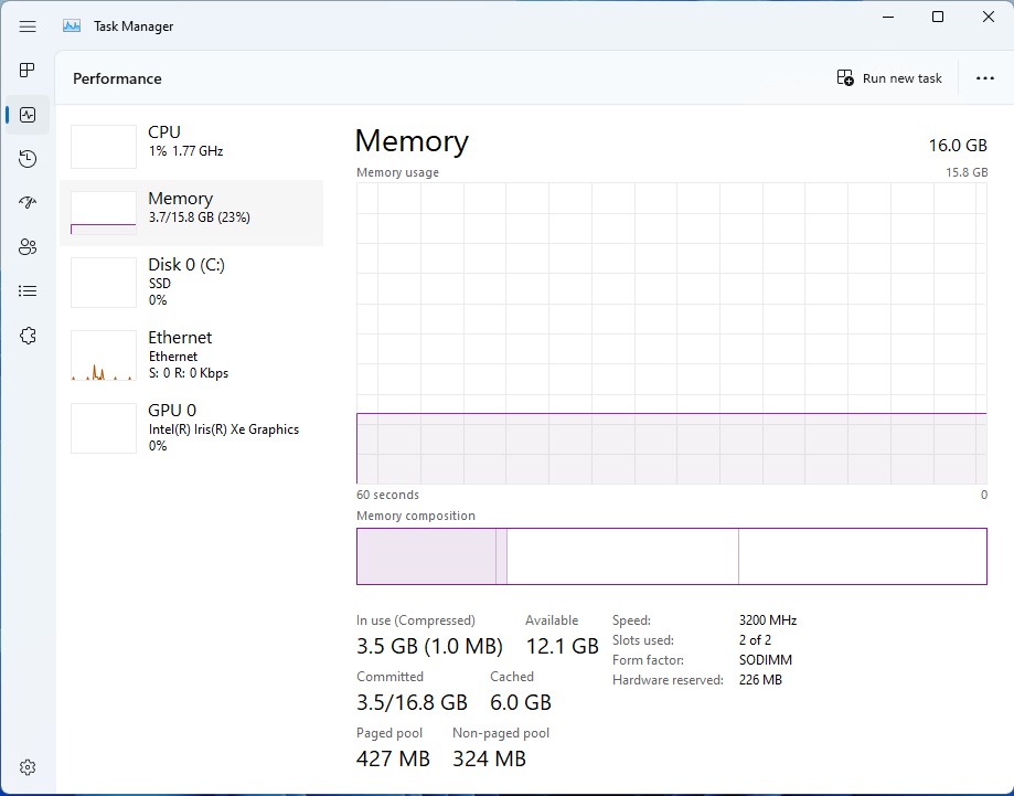 Также есть два слота памяти SODIMM, поддерживающие до 64 ГБ памяти, а модель для обзора включала две планки памяти Crucial 8 ГБ DDR4 3200 МГц, всего 16 ГБ:
