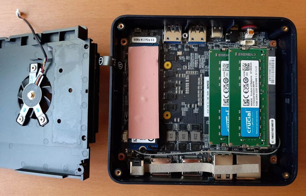 Под отсеком для дисков находится материнская плата с твердотельным накопителем M.2 2280 NVMe PCIe Gen 4.0 (обзорная модель включала накопитель Kingston NV2 емкостью 500 ГБ с установленной Windows 11 Pro), который, в свою очередь, закрывает M.2 2230 WiFi 6. (или 802.11ax) карта Intel AX201: