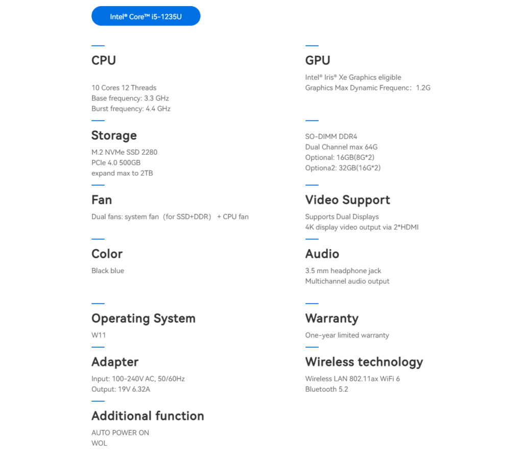Beelink SEi12 физически состоит из квадратного металлического корпуса размером 126 x 113 x 42 мм (4,96 x 4,45 x 1,65 дюйма) с новым и инновационным водонепроницаемым верхом, покрытым тканью. В качестве мини-ПК с активным охлаждением он использует процессор Intel Alder Lake Core i5-1235U, который имеет 12 потоков с 2 «производительными» ядрами с тактовой частотой 4,40 ГГц и 8 «эффективными» ядрами с тактовой частотой 3,30 ГГц и включает в себя Intel Iris Xe Graphics. .