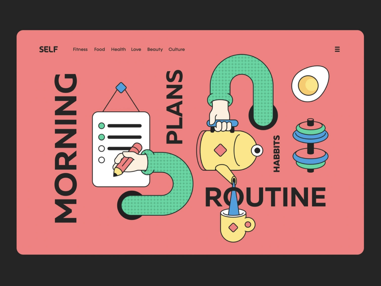 Дизайн на выходе получается акцентным за счёт сложной композиции, но всё ещё остаётся минималистичным, так как используется минимум цветов (которые могут быть суперяркими), один-два шрифта и выдержанная сетка.