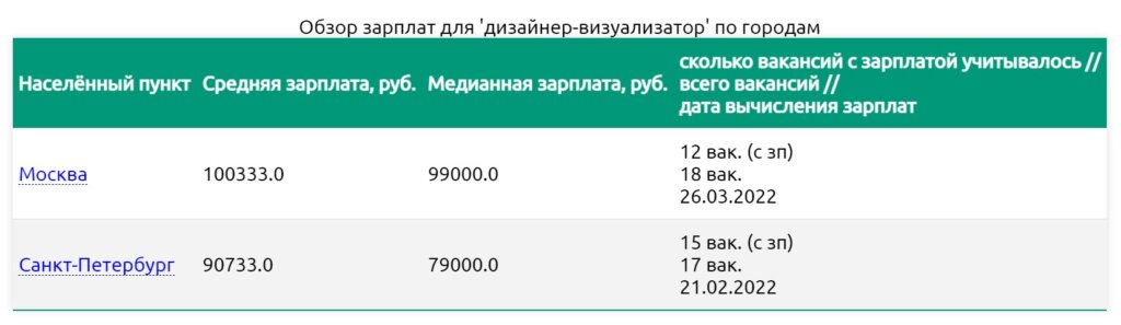 Лидирующие зарплаты дизайнера-визуализатора по городам в феврале и марте 2022 года. Источник