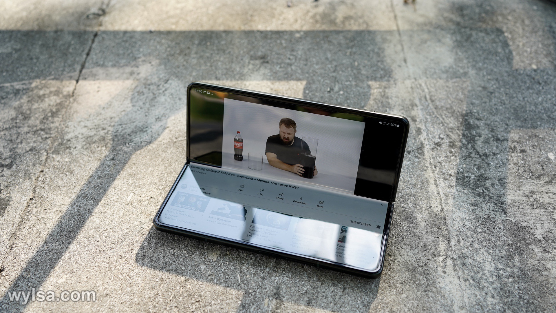 На YouTube просмотр видео на одной стороне экрана в режиме ноутбука или палатки — очень приятный опыт. Но не могли бы мы сделать то же самое в полноэкранном режиме с полностью развернутым смартфоном, позволяя устройству стоять против чего-то, чтобы оставаться в вертикальном положении?