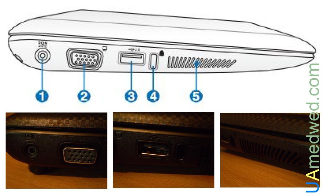 - 4 – Порт замка Kensington: сюда можно засунуть металлический замок со шнуром и прикрепит нетбук к чему то тяжелому