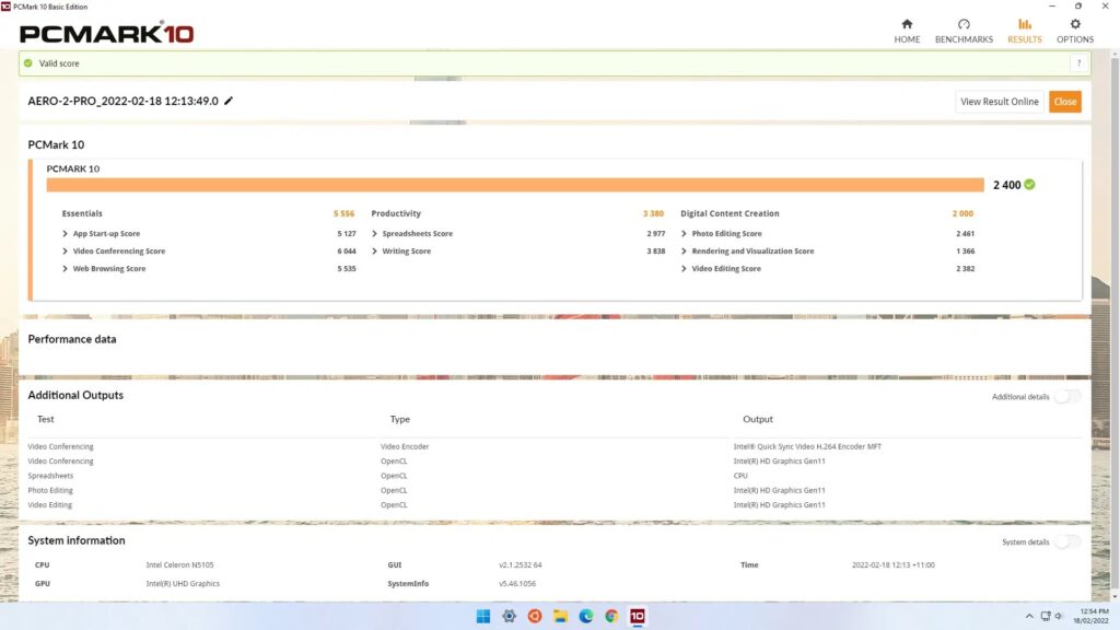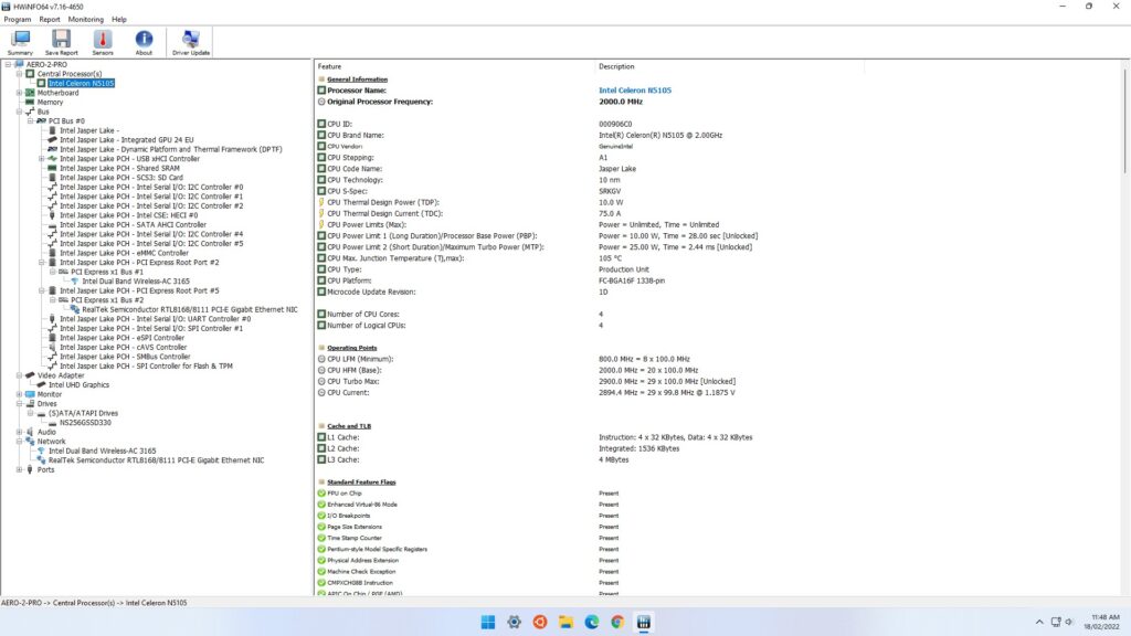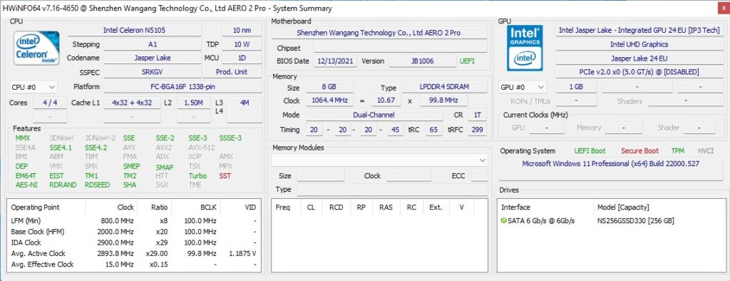 Aero 2 Pro физически состоит из прямоугольного металлического корпуса размером 120 x 120 x 23 мм (4,72 x 4,72 x 0,91 дюйма) с вставными передней и задней пластиковыми панелями. В качестве мини-ПК с активным охлаждением он использует 10-нм процессор Intel Jasper Lake N5105, который представляет собой четырехъядерный 4-поточный процессор Celeron с тактовой частотой 2,00 ГГц, повышающийся до 2,90 ГГц с графикой Intel UHD Graphics.