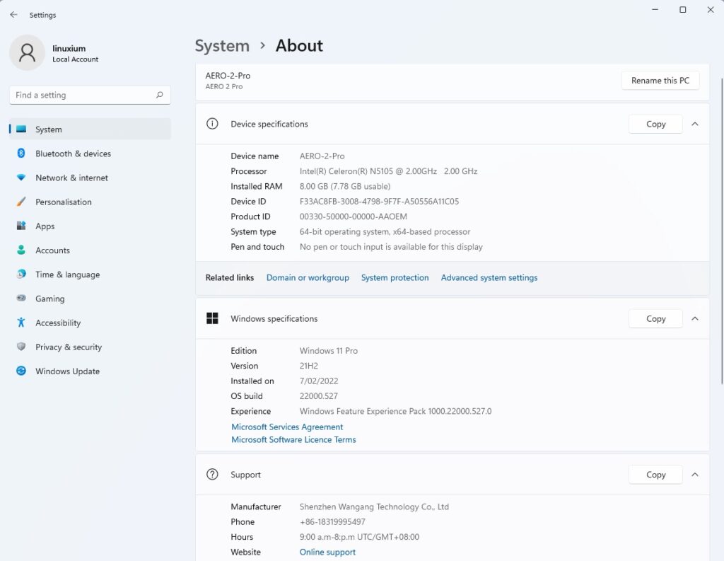 В конце концов, нам удалось обносит операционную систему до Windows 11 Pro 21H2, сборка 22000.527, и быстрый просмотр информации об оборудовании показал, что она соответствует спецификации, отметив выступ USB выше: