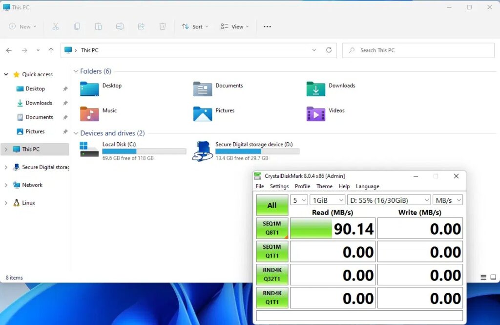 Краткая проверка показала работающие аудио, Wi-Fi, Bluetooth и Ethernet. Мы также подтвердили, что SD-карта работает, так как ее можно использовать как форму расширения памяти, хотя и довольно медленно: