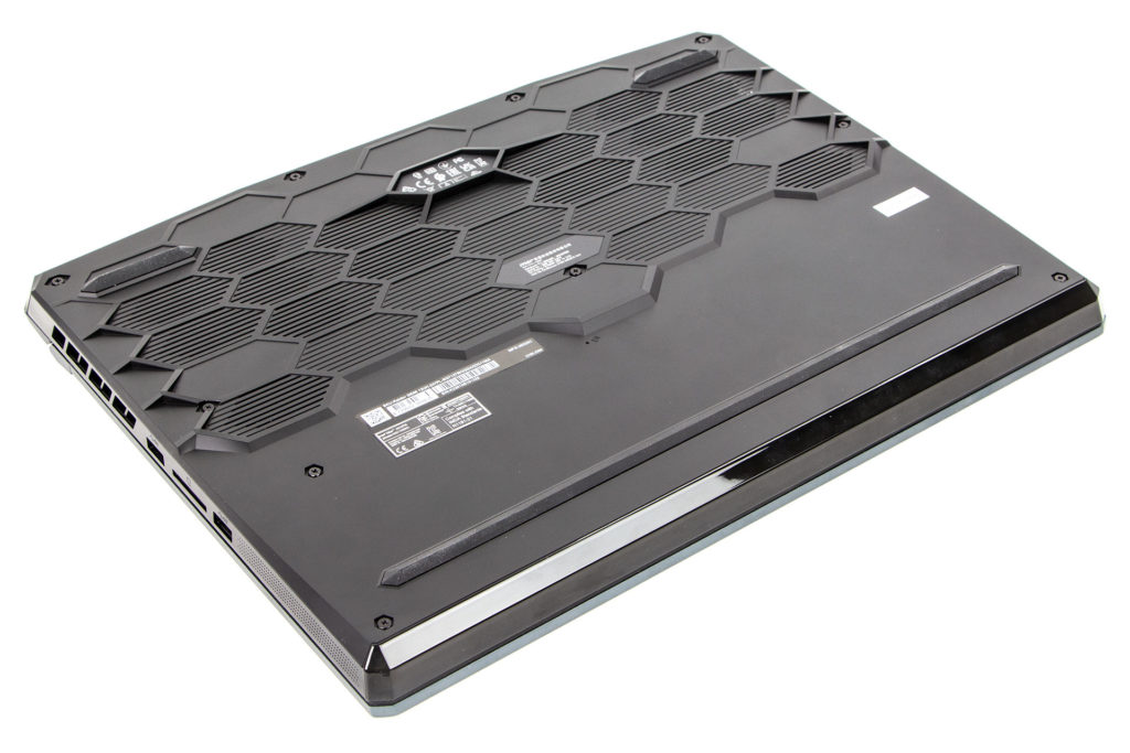 На нижней стороне более половины поверхности перфорировано для подачи свежего воздуха в обширную систему охлаждения. За устойчивое положение ноутбука отвечают 3 резиновые подставки (та, что под передней, на всю длину ноутбука). Интересно, что центр конструкции также имеет точки опоры, что обеспечивает столь высокую жесткость устройства.