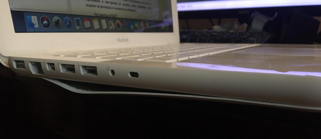 Пожалуй, это одна из самых больших проблем данного девайса, а скорее, единственный косяк. Видимо, не всегда все было хорошо у данного яблочного ноутбука, его гоняли по-серьезному, из-за чего он перегревался и мать-физика не оставила шансы резиновому чехлу поддона: он растянулся и стягиваться не собирается.