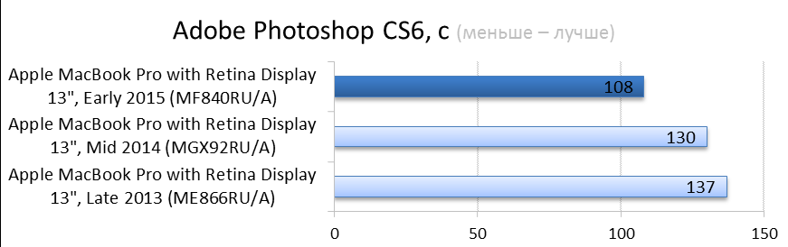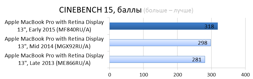 Мы тестируем конфигурацию MacBook Pro с базовым CPU, 8 Гбайт RAM и SSD объемом 256 Гбайт. Прогресс в процессорном бенчмарке по сравнению с базовыми «прошками» предыдущих лет определяется разницей в тактовых частотах. Соответственно, преимущество новинки перед моделью 2014 года довольно скромное.