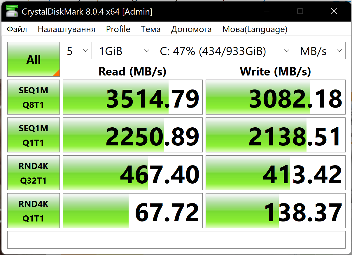 Накопитель подключается по интерфейсу SATA 3через разъём М.2. Вот результаты бенчмарка скорости записи и чтения c SSD: