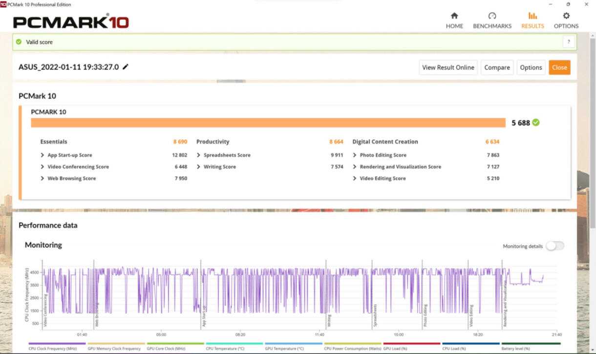 GeekBench 5 даёт ноутбуку ASUS около 1499 очков в одноядерном и 9053 – в многоядерном режиме. К примеру, у MSI GS66 Stealth всего 1247/6505 баллов, а у Gigabyte Aero 17 HDR XB – 1137/5681. В тесте PugetBench DaVinci Resolve ноутбук набирает 938 очка – не хуже, чем у многих ПК топ-уровня. В тесте PugetBench Premiere Pro Standard у ProArt Studiobook 16 OLED около 698 балл.
