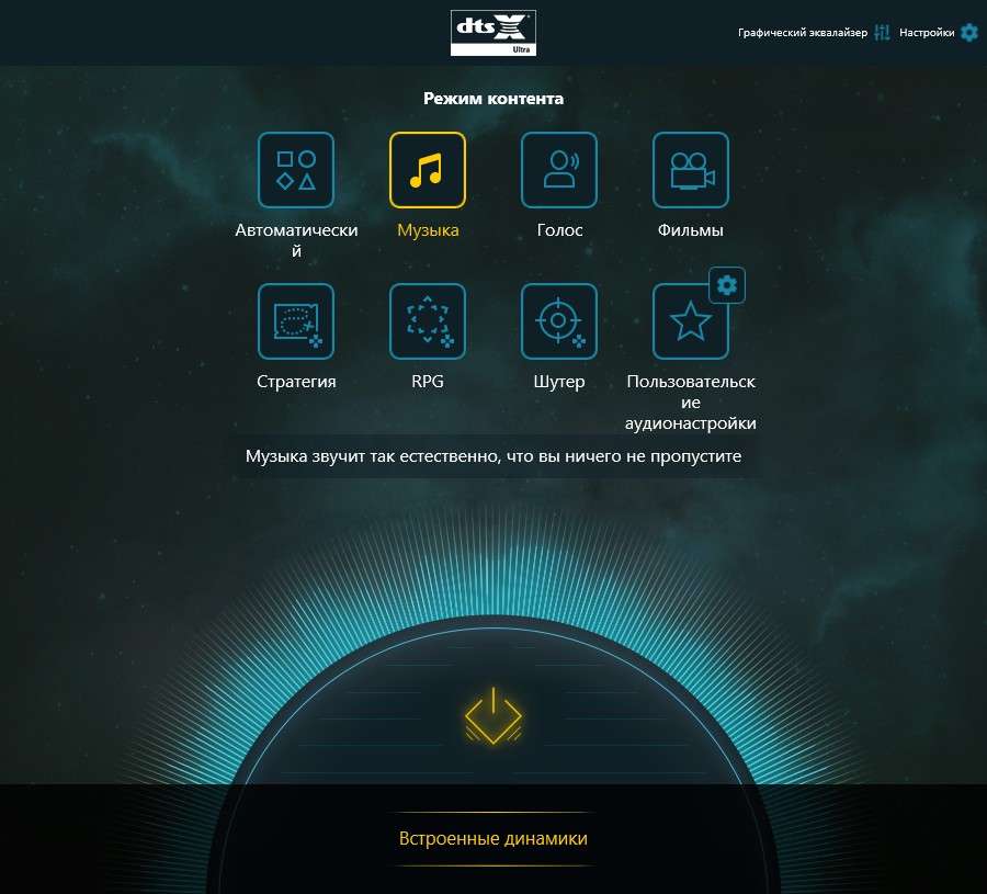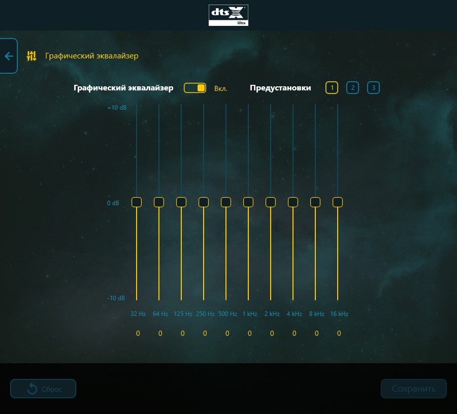 В утилите, понятное дело, есть и другие пресеты. С акцентом на голос, оптимизацией под фильмы и определенные жанры игр. Также присутствует графический эквалайзер на 10 полос, если ни одна из заготовок вам не подойдет.