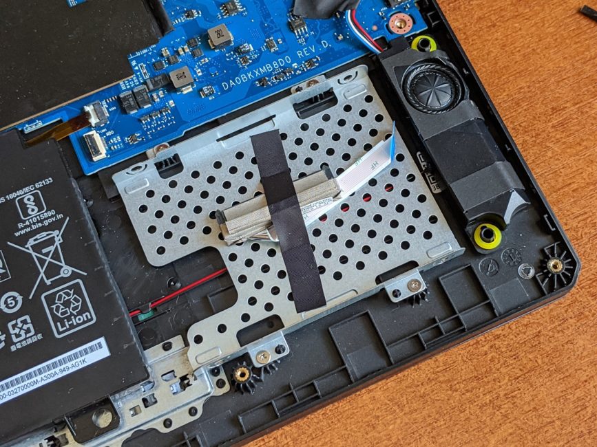 Объём установленного твердотельного накопителя составляет 480 Гбайт, подключён он по протоколу NVMe (PCIe). Жёсткий диск в нашей модификации ASUS FX705DY не был установлен, однако, для него есть своё посадочное место внутри ноутбука, а в комплекте поставляются винты для крепления «харда».