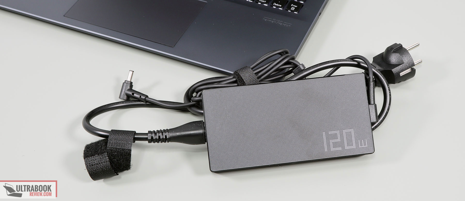 The M3500QC configurations of this VivoBook Pro 15 ship with a mid-sized 120W charger, which plugs in via a standard barrel plug. USB-C charging is not possible here.