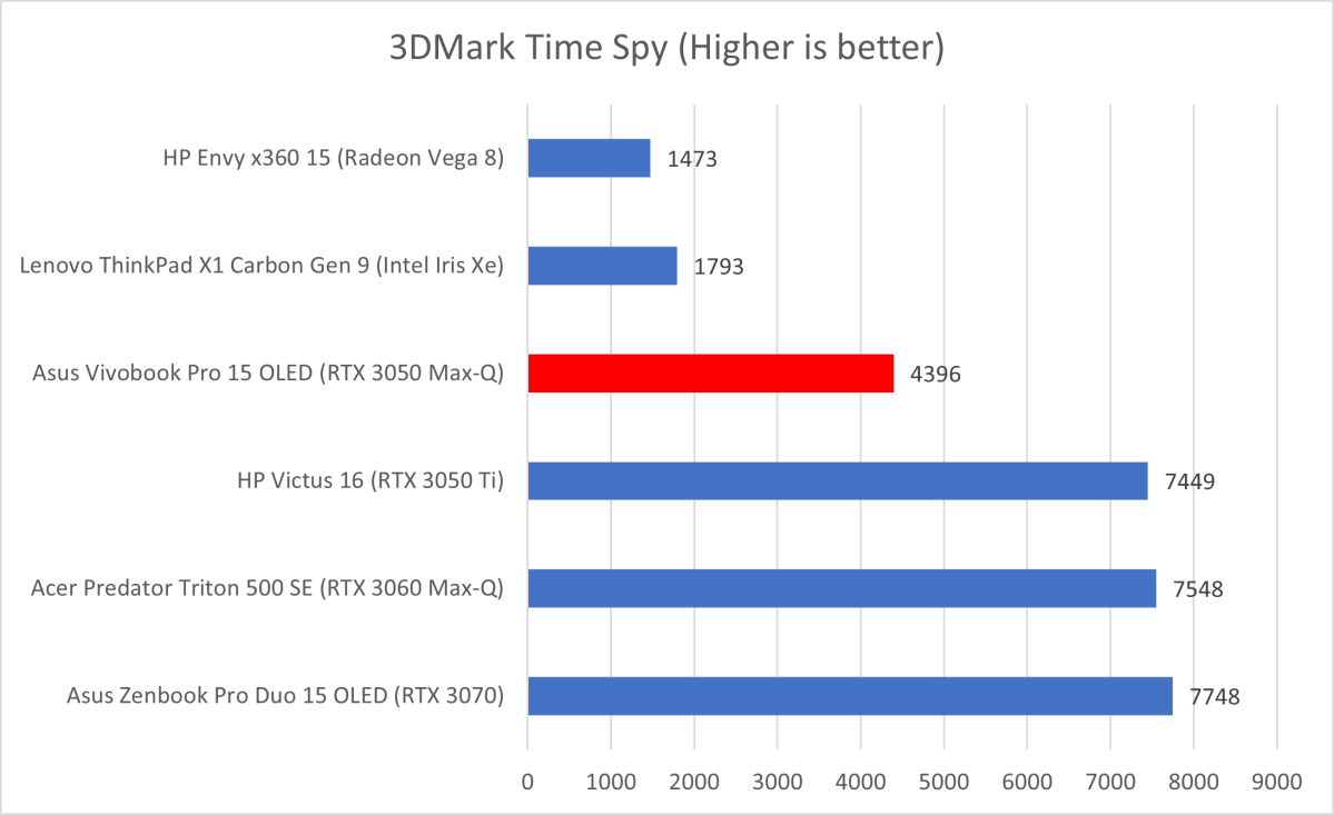 3DMark Time Spy, a synthetic 3D benchmark, is harder to interpret. It’s clear the Vivobook Pro 15 OLED is much quicker than laptops that rely on integrated graphics such as the HP Envy x360 15’s Radeon Vega 8. However, the Vivobook ends up far behind the RTX 3050 Ti in the larger HP Victus 16. This isn’t a shock, as experience has shown that GPU performance can vary drastically from one laptop to the next even if they look somewhat similar on paper. Still, I was hoping to see the Vivobook score closer to 5,000.