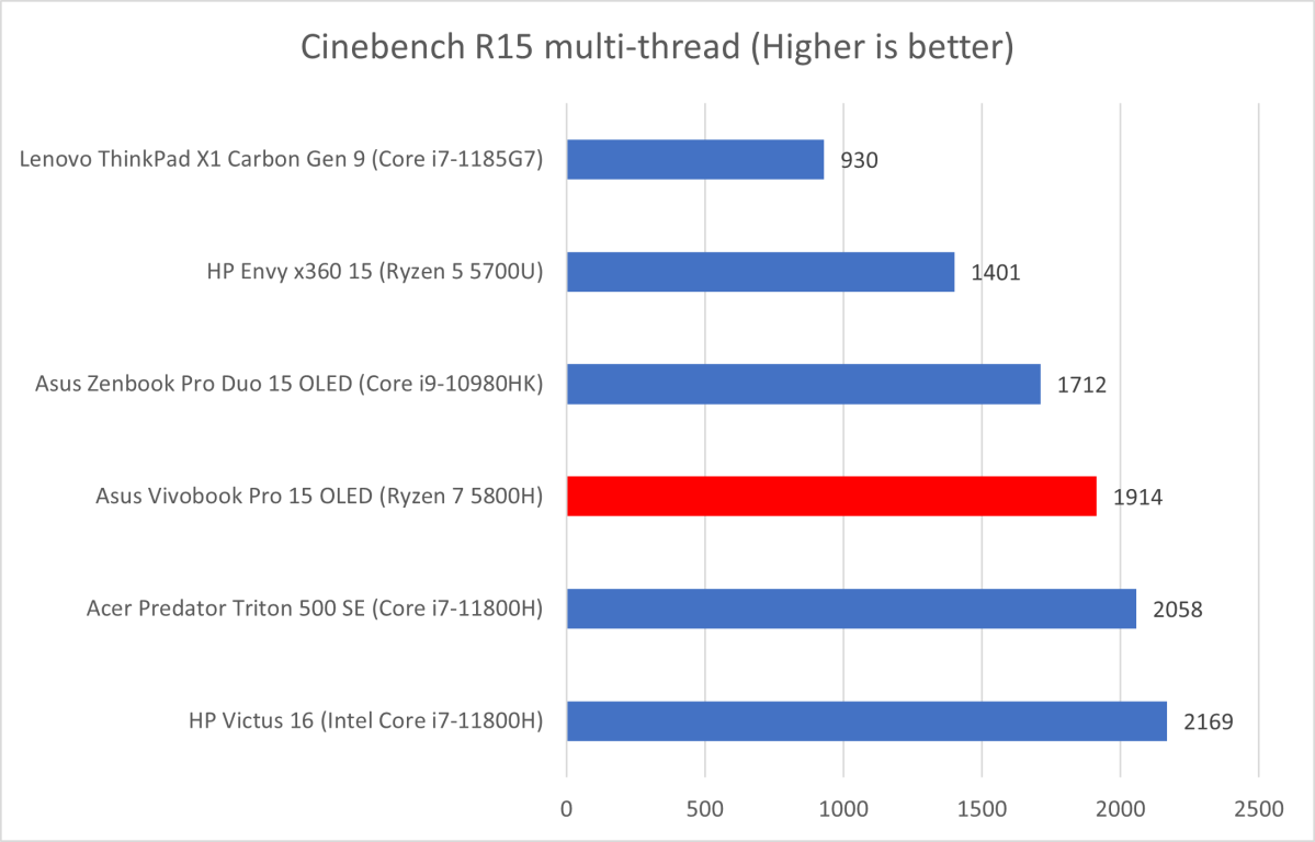 The Cinebench R15 multi-threaded CPU benchmark also had good things to say about the Vivobook Pro 15 OLED. Here the laptop is just a hair behind the Acer Predator Triton 500 SE and HP Victus 16. It easily beats the HP Envy x360 15. That shows the Vivobook Pro 15 OLED offers a meaningful performance advantage over a less performance-oriented 15-inch laptop.