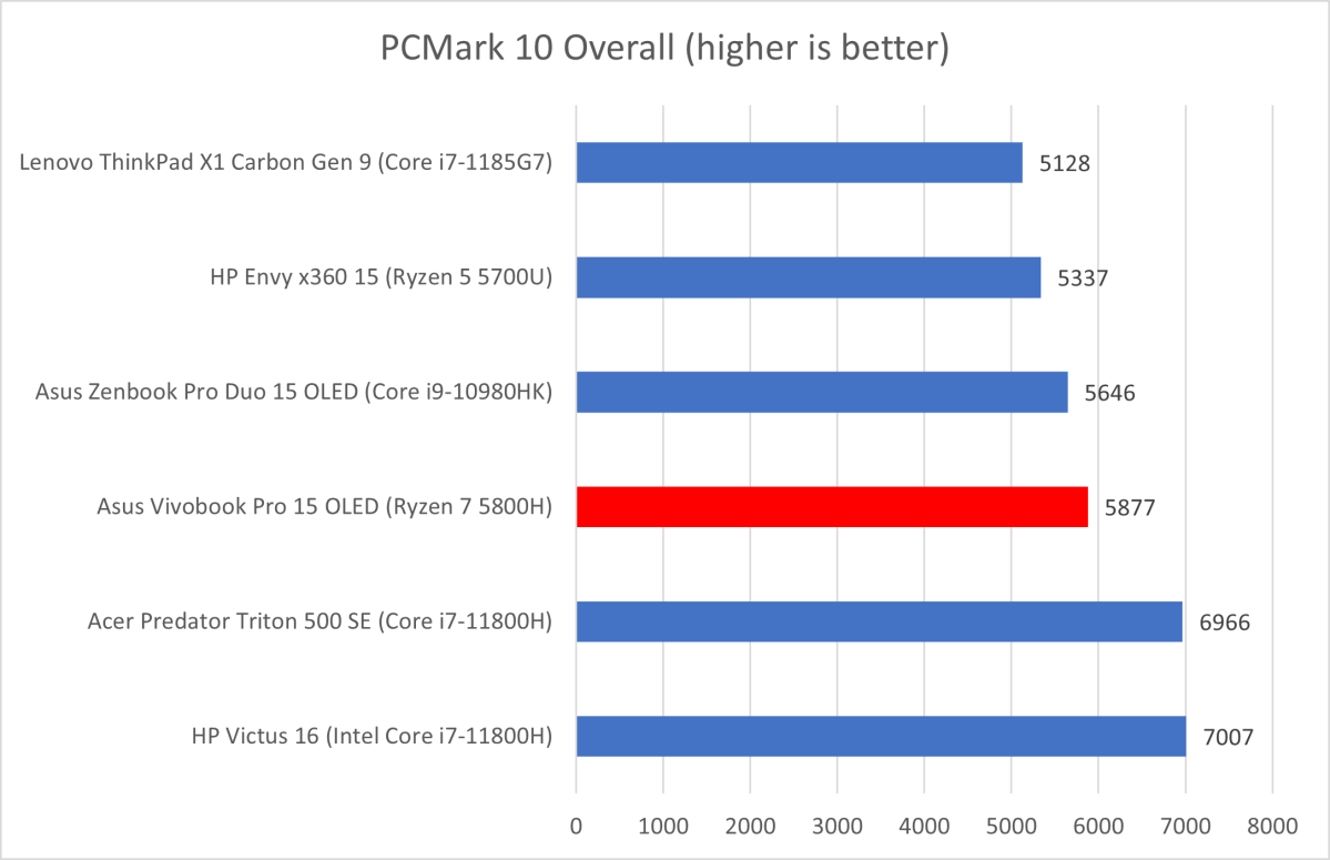However, laptops that outperform the Vivobook Pro 15 OLED are typically a bit larger and heavier than the Asus. With that in mind, the Vivobook’s result looks strong. It beats other mid-range laptops we’ve recently tested, such as the HP Envy x360 15. Surprisingly, it even beats the older Asus Zenbook Pro Duo 15 OLED, which we tested with an Intel Core i9 10th-gen processor.