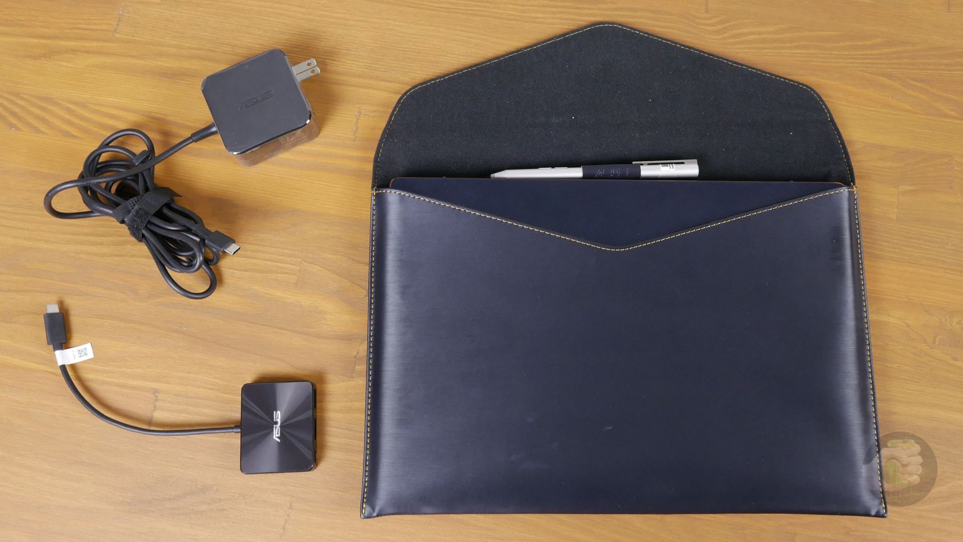 В коробке с ноутом лежали кожаный чехол, стилус и переходник с USB-C на самый обычный USB-A, HDMI и ещё один USB-C. Всё, кроме чехла, блока питания и ноутбука — опции.
