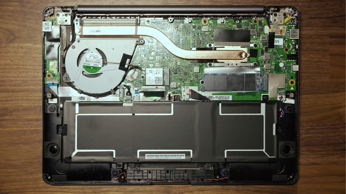 На нижней поверхности нет ничего, кроме вентиляторов и товарных знаков. В продаже доступны две расцветки: синяя (Ponder Blue) и светло-зелёная (Aqua Celadon). Шарнир сделан так, что при открытии ноутбука верхняя часть клавиатуры немного приподнимается, чтобы обеспечить лучший проток воздуха снизу. Дисплей наклоняется под любым углом до 180 градусов – в максимальном положении экран фактически лежит на столе.