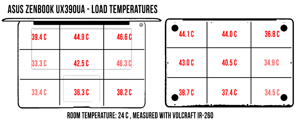 Нагрев корпуса при нагрузке заметен, но не превышает разумные показатели. Работал с ноутом на коленях и дискомфорта не испытал.
