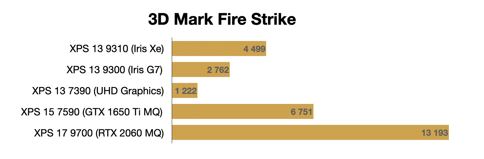 За счёт чего гуляем? За счёт сильно «прокачанной» встроенной в чипсет графики Intel Iris Xe c частотой 1,3 ГГц и 96 исполнительными блоками. Тут самыми показательными будет тест 3DMark, в котором мы сравнили несколько разных моделей ноутбуков. И 4500 очков в стандартном FireStrike для ультрабука – это по-настоящему впечатляющий результат. В Time Spy оценка составляет 1558 очков – зафиксируем для будущих сравнений.