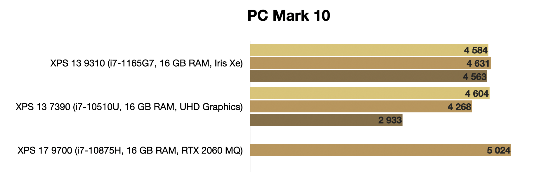 Тестов общей производительности системы PCMark 10 для XPS 13 9300 у нас, к сожалению, нет, но сравнение с XPS 13 7390 c i7-10510U и таким же объёмом оперативной памяти тоже получается крайне наглядным. Если в базовом тесте Express разницы нет, то в стандартном, который активнее задействует GPU, она уже составляет более 7%, а в самом сложном испытании Extended оказывается в 1,5 раза выше! При прямом сравнении с XPS 13 9300 с i7-1065G7, судя по всему, результаты у новой модели были бы в среднем на 15-20% лучше. Не радикальный прирост, но весьма приятный.