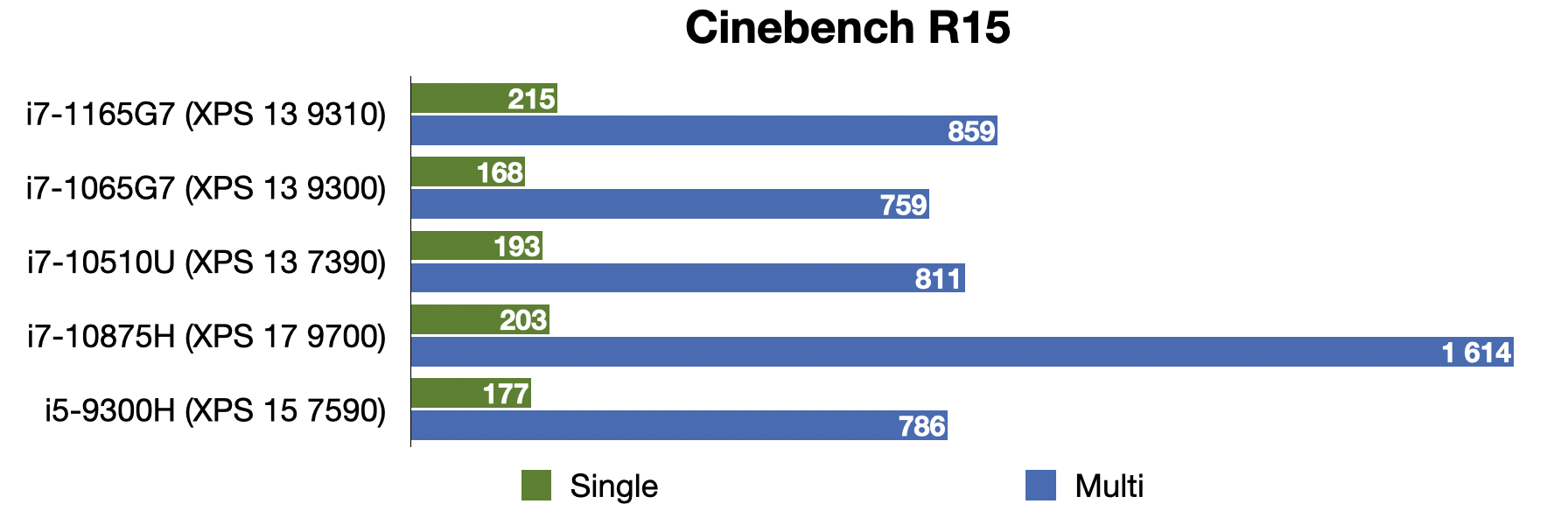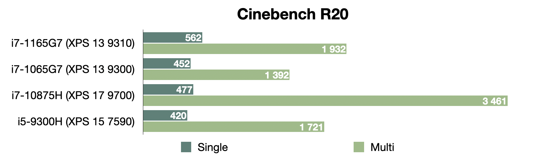 И сразу поговорим о процессоре, ведь все ключевые изменения здесь сводятся именно к нему. Заметный прирост производительности виден даже в Cinebench R15 и R20: как в одноядерном, так и в многоядерном режимах i7-1165G7 опережает i7-1065G7 в среднем на 15-20%.