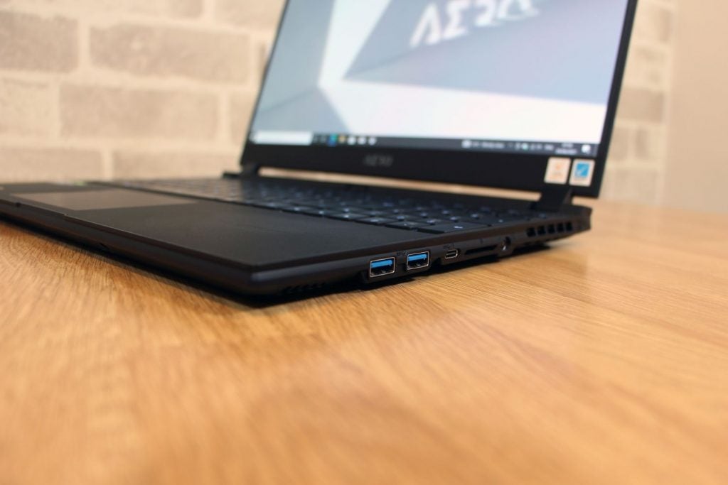 Видеовыходы HDMI и mini DisplayPort находятся на левом краю ноутбука, вместе с портом USB 3.2 Type-A, разъемом Ethernet 2,5 Гбит / с и аудиоразъемом. Еще два порта USB-A 3.2 присоединяются к одному порту Thunderbolt 3 / USB-C, слоту для SD-карты и разъему для адаптера переменного тока справа. Gigabyte забыла про слот для замка безопасности с тросиком.