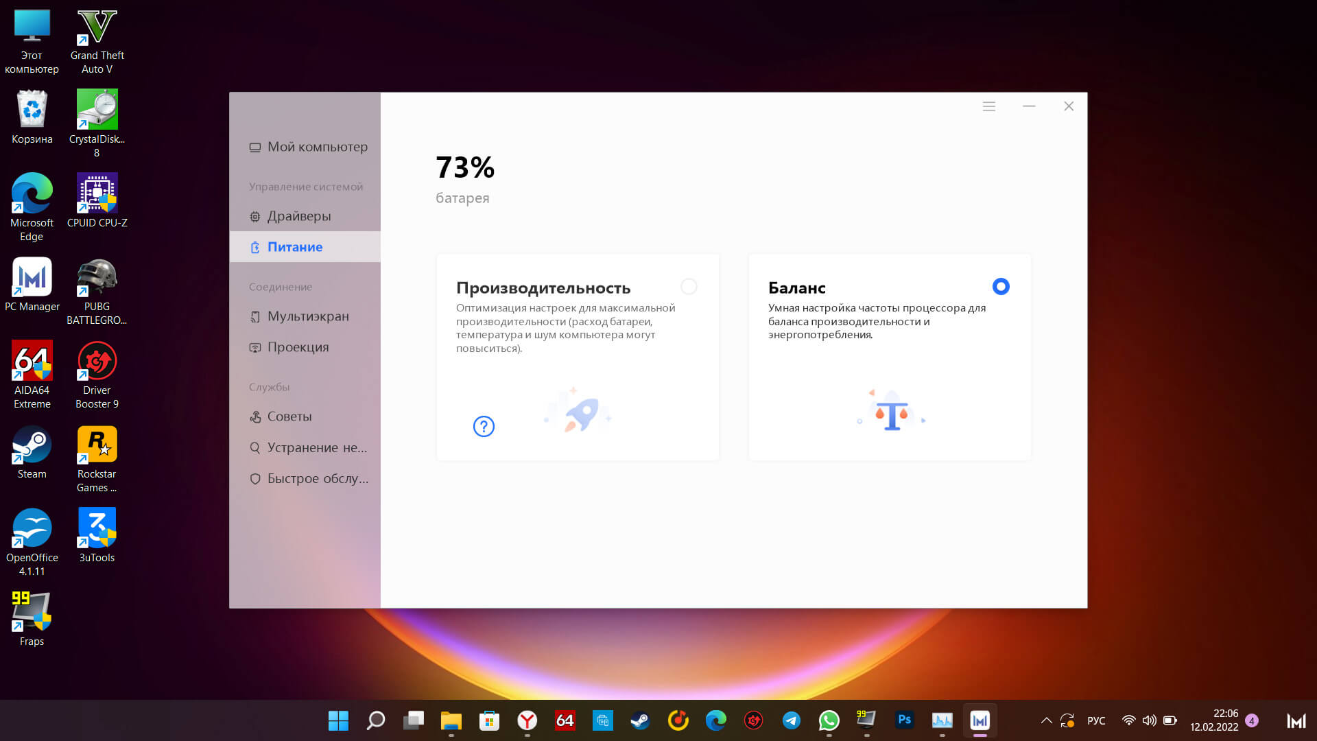 Фирменное программное обеспечение предусматривает два режима работы ноутбука: производительный и сбалансированный. Их можно переключать напрямую сочетанием клавиш Fn+P, но нужно помнить, что производительный режим активируется только при питании ноутбука от электросети и заряде аккумулятора не ниже 20%. Сбалансированный же режим доступен всегда.