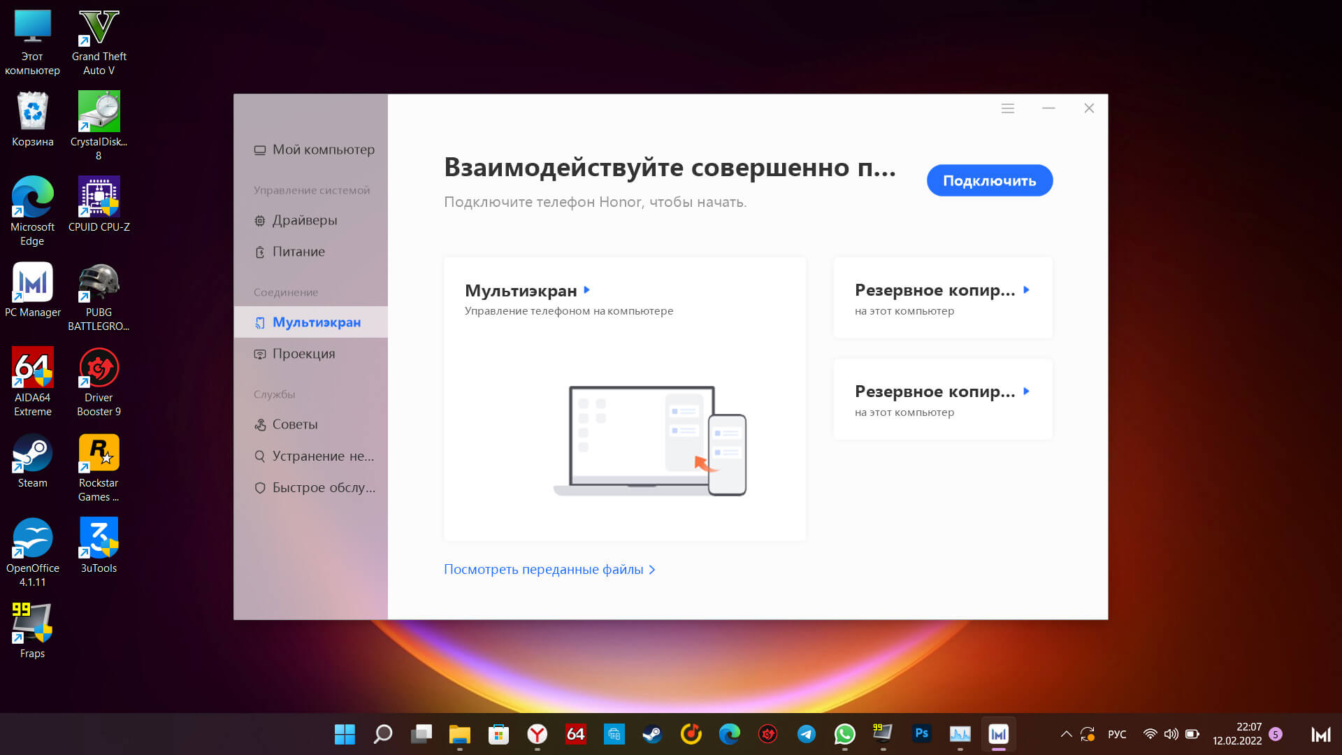 «Питание», которая позволяет настроить работу аккумулятора и оптимизировать работу процессора и батареи. Вкладка «Мультиэкран» расширяет взаимодействия смартфона с компьютером, разрешая PC Manager управлять рабочим столом мобильного устройства. Для этого потребуются совместимые смартфоны от Huawei и Honor. «Проекция» – демонстрация экрана на «умный» экран Vision от Huawei или планшет аналогичной марки.