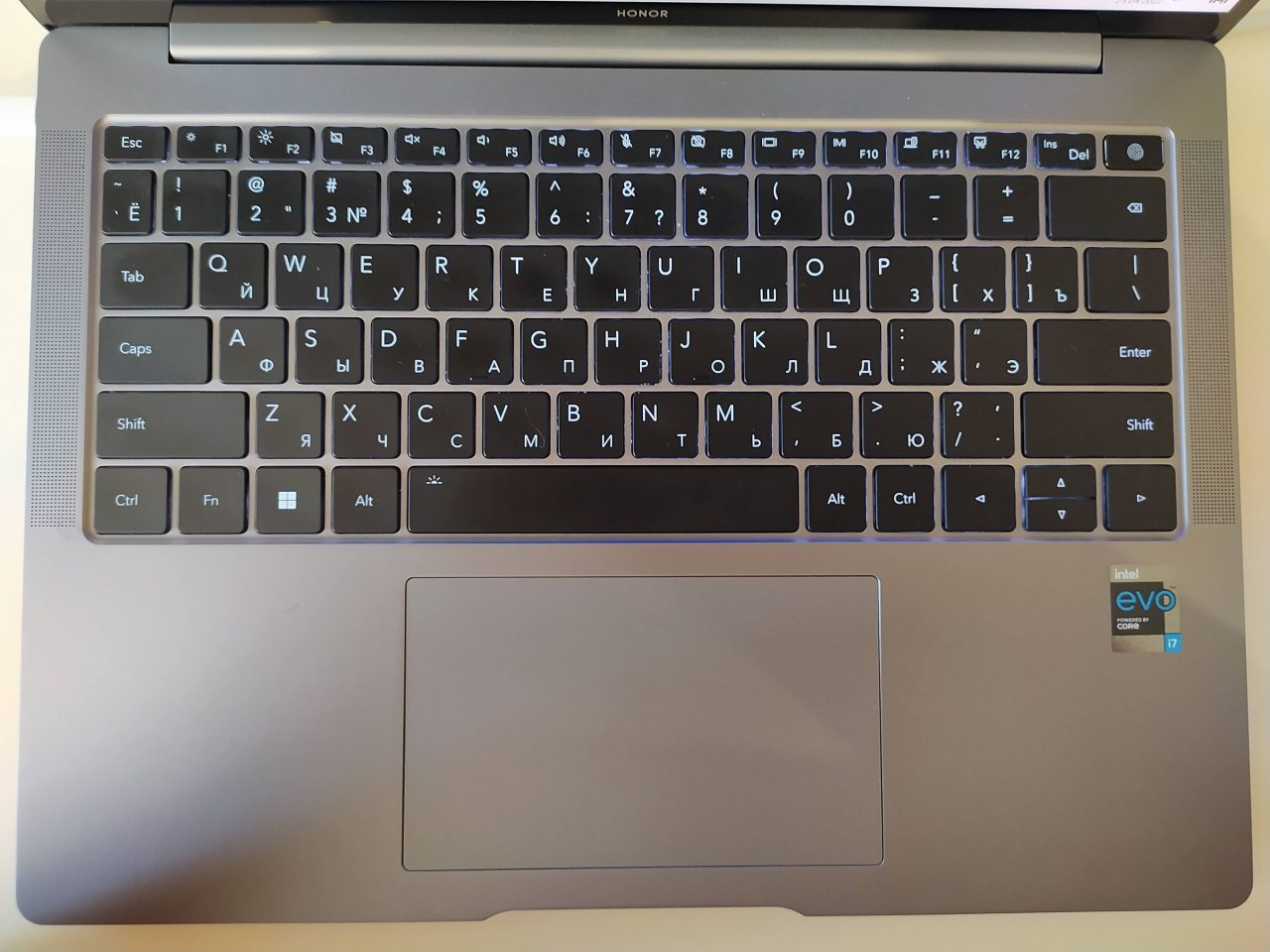 Заметных минусов мне не встретилось, печатать удобно. Единственное, что приходит в голову, это вкусовщина: после Honor MagicBook 15 (обзор) с неровной текстурой клавиш, плоские кнопки MagicBook 16 кажутся скользкими. С другой стороны, у MagicBook 15 нет подсветки клавиш, так что предпочтение я бы всё равно отдал новой модели.