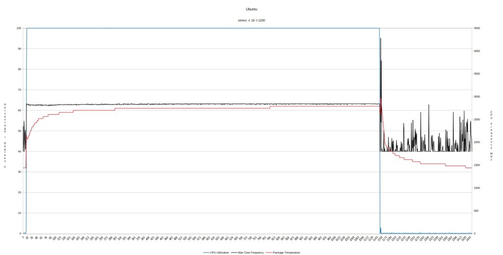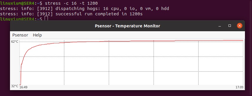 SER4 использует активное охлаждение, которое является очень эффективным. При выполнении стресс-теста в Ubuntu температура процессора поднялась максимума до 62°C, где она оставалась на протяжении всего теста:
