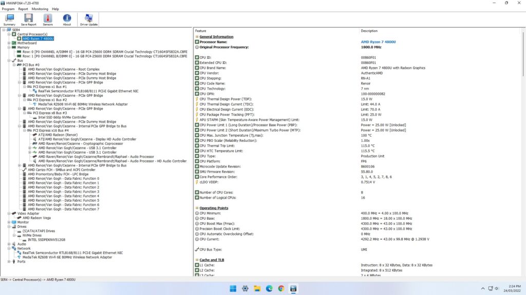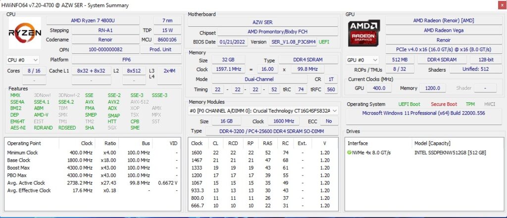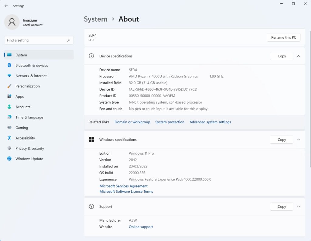 Изначально на Beelink SER4 была установлена лицензионная версия Windows 11 Pro версии 21H2, которую получилось без проблем обновить до сборки 22000.556. Информация об оборудовании выглядит следующим образом: