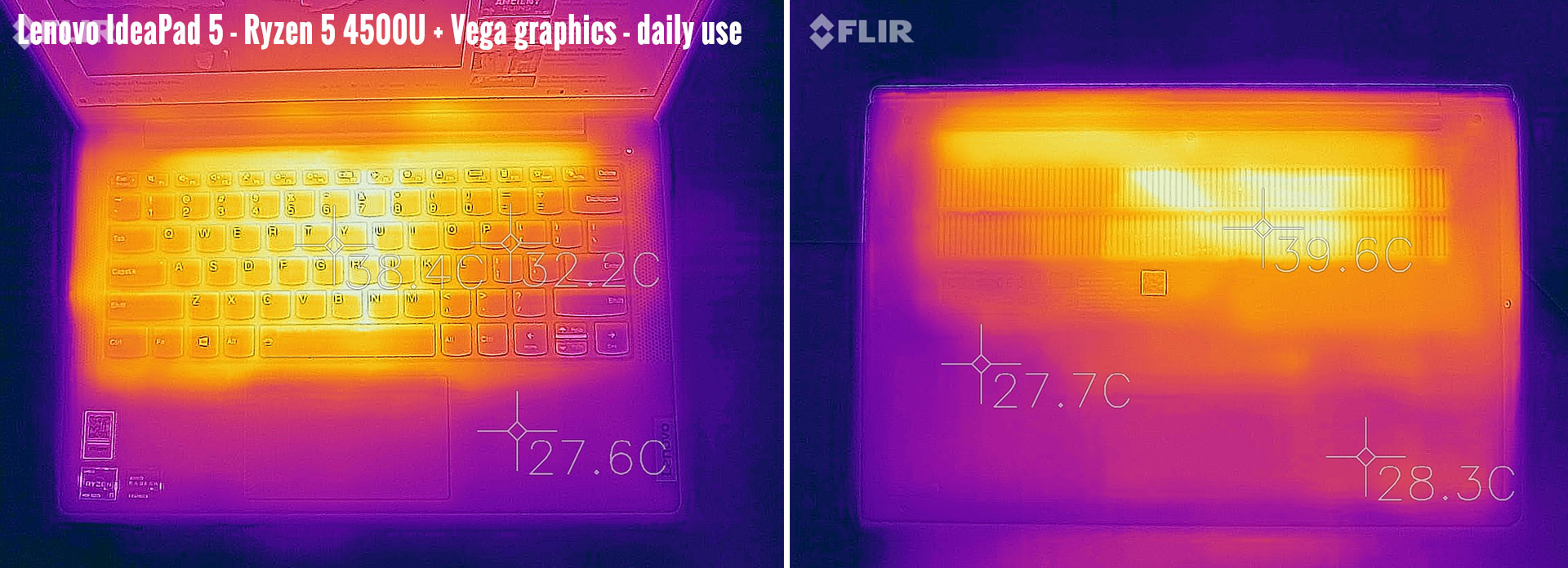 We recorded temperatures in the mid-40s in the middle of the keyboard, on top of the AMD processor, and mid-50s around the radiator, but also 60+ on the underside, around the thermal module. Furthermore, hot air is blown into the screen, with the panel reaching 40-45 degrees around the exhausts. At the same time, the fan spins at around 39-41 dB in this case.