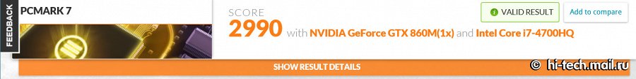 - Производительность. Модель с установленным процессором Intel Core i7–4710HQ на четыре ядра, базовая частота которого — 2,5 ГГц. Применение технологии Intel Turbo Boost позволяет при увеличении нагрузки разгонять ядра до 3,5 Ггц, а благодаря Intel Hyper-Threading каждым из ядер может обрабатываться по два потока данных. Таким образом, процессор осуществляет обработку одновременно восьми потоков информации. В гаджете установлена мощная видеокарта NVIDIA GeForce GTX 860M на 4 ГБ. Объем ОЗУ лэптопа составляет 16 ГБ. Устройство с высокой производительностью, позволяющей ему справляться с наиболее требовательными современными играми. Жесткий диск аппарата имеет емкость 1 ГБ, что вполне достаточно для загрузки фильмов, музыкальных композиций, документов, фотографий.
