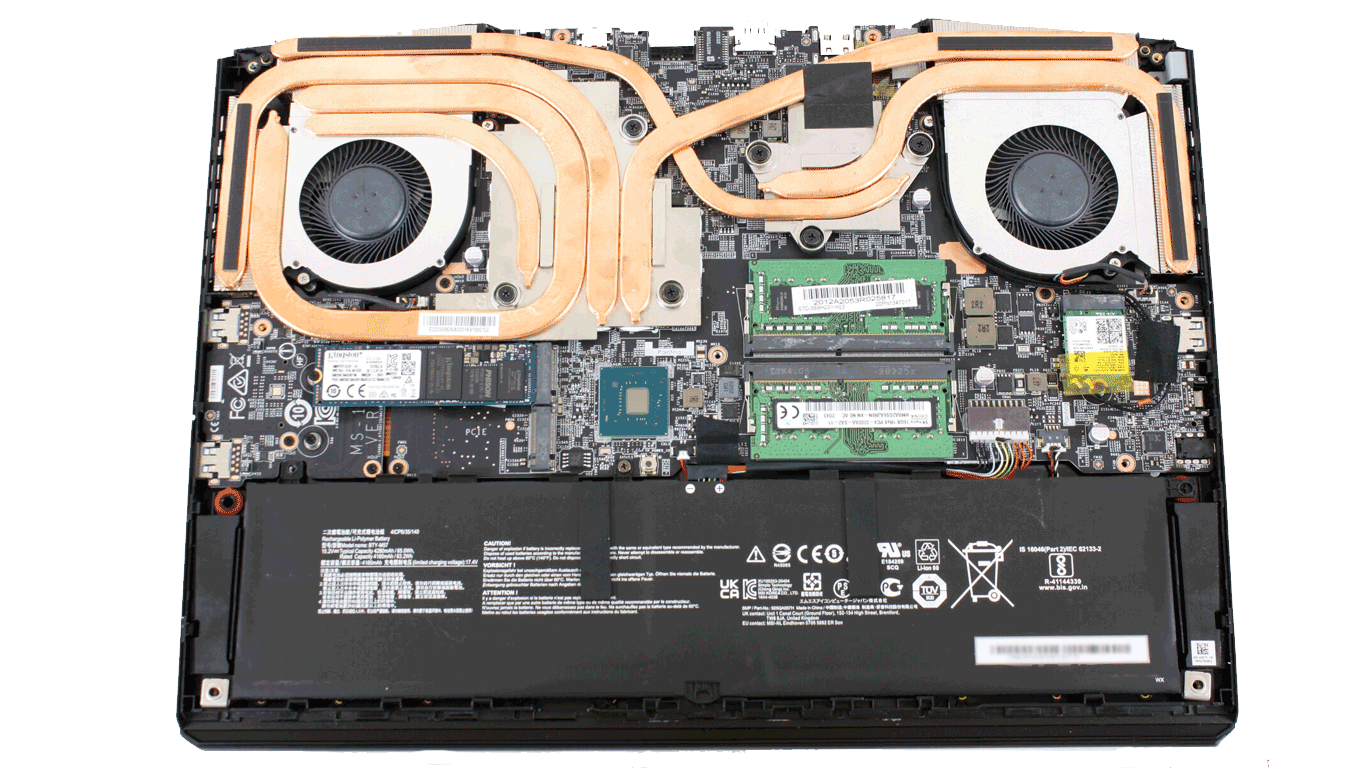 Нижняя крышка крепится на обычных почти одинаковых винтах, один из которых прикрыт пломбой. Снятие нижней панели гораздо сложнее, чем ну GP65, потому что, днище у GP66 прилегает к краям гораздо плотнее. Оказавшись внутри, пользователи получат доступ к 2 слотам M. 2 2280, двум слотам SODIMM, батарее и системе охлаждения.