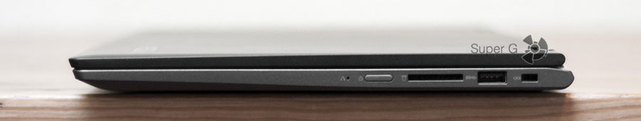 На левой грани корпуса расположилось круглое гнездо зарядки, аудиоразъём, HDMI, а также по порту каждого вида: USB-C и USB 3.0. На правой стороне мы видим ещё один USB 3.0, замок Kensington Lock и карт-ридер. Всё, больше никаких гнёзд на ноуте нет. Кстати, справа также красуется кнопка питания с подсветкой. И у неё жутко неудобное расположение.
