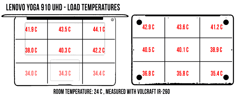As far as the cooling on the Yoga goes, Lenovo uses a system with two small fans and heatpipes on top of the motherboard (so repasting would require a complete disassembly). The entire cooling is miniaturized to fit the laptop’s slim body and has very limited intake, given there are no intake cuts on the bottom, as well as limited exhaust through those tiny holes behind the hinge. As a result, this laptop gets warm with daily multitasking and the fans have to spin all the time. They’re not very loud, at 38-39 dB at head level, but have a rather high pitch sound that makes them stand out.