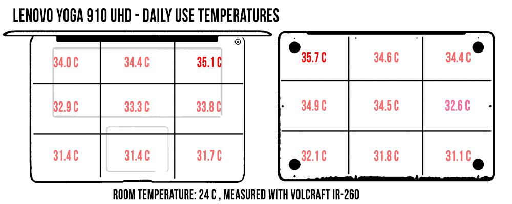 The picture below shows that the back and interior get fairly warm with multimedia use, and those numbers jump closer to 40s with everyday multitasking, which is a little high for my taste to be comfortable to use on the lap. Not unexpected though, given how thin this is.
