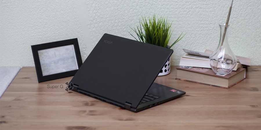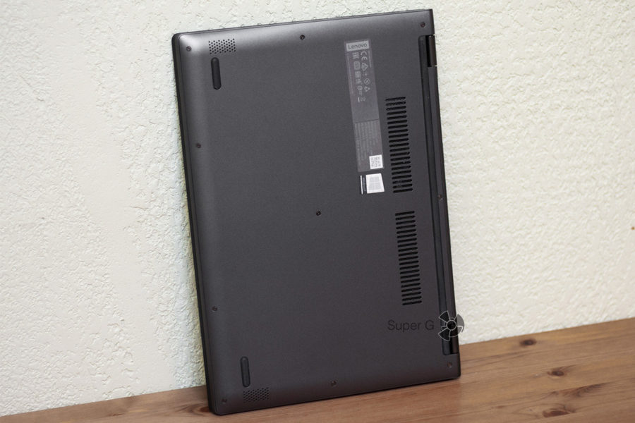 Сзади никаких элементов нет, только воздухоотводы, а решётки динамиков поставили на дно корпуса, рядом с резиновыми ножками. Очередное сомнительное решение, потому что динамики почти полностью закрываются поверхностью стола. В итоге из-за такой конструкции звук Yoga 530 немного приглушается, когда стоит в обычном положении.