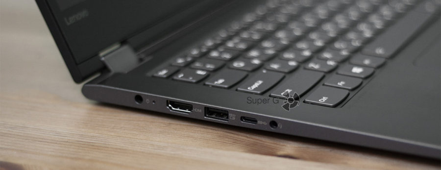 Корпус нашего Lenovo Yoga 530-14IKB окрашен в серый цвет, причем верхняя крышка темнее чем рабочая область. Всего в линейке предусмотрено три цвета: черный, серый и светло-голубой. Со слов Lenovo, корпус сделан из алюминия, который придает конструкции прочности, да и на ощупь такой материал приятнее. На крышке имеется всего одна надпись «Yoga» в верхнем левом углу. Верхнюю и нижнюю часть корпуса соединяют две небольшие петли. Они довольно тугие, так что одной рукой ноутбук не открыть. Есть четыре сценария использования трансформера: ноутбук, планшет, презентация и консоль. Габариты Lenovo Yoga 530-14IKB составляют 328 x 229 x 17,6 мм, масса – 1,6 кг, ноутбук достаточно легкий, поэтому носить его постоянно с собой большого труда не составит. Трансформер имеет неплохой набор портов. Мы не ожидали увидеть порты, которые можно встретить только на флагманском моделях. Все порты равномерно распределены по левой и правой стороне устройства. Порты по традиции располагаются по бокам ноутбука. Тут без изысков, но все необходимое присутствует: два USB 3.0, один USB Type-C, видеовыход HDMI и картридер. На правом боку находится еще и кнопка включения. Странно, что сюда же не были выведены качельки громкости. Кстати, если вам необходимо подключение к всемирной Сети по проводу, то придется раскошелиться на соответствующий переходник. В комплекте поставки присутствует только адаптер питания. Что бы получить доступ к внутренностям придется снимать днище, открутив 10 винтов. Про звуковую систему этого ноутбука можно сказать, что она выглядит неплохо, но от полноформатных мультимедийных ноутбуков заметно отстает. Два встроенных динамика с выводом звука справляются отлично, звук достаточно громкий искажений практически нет.