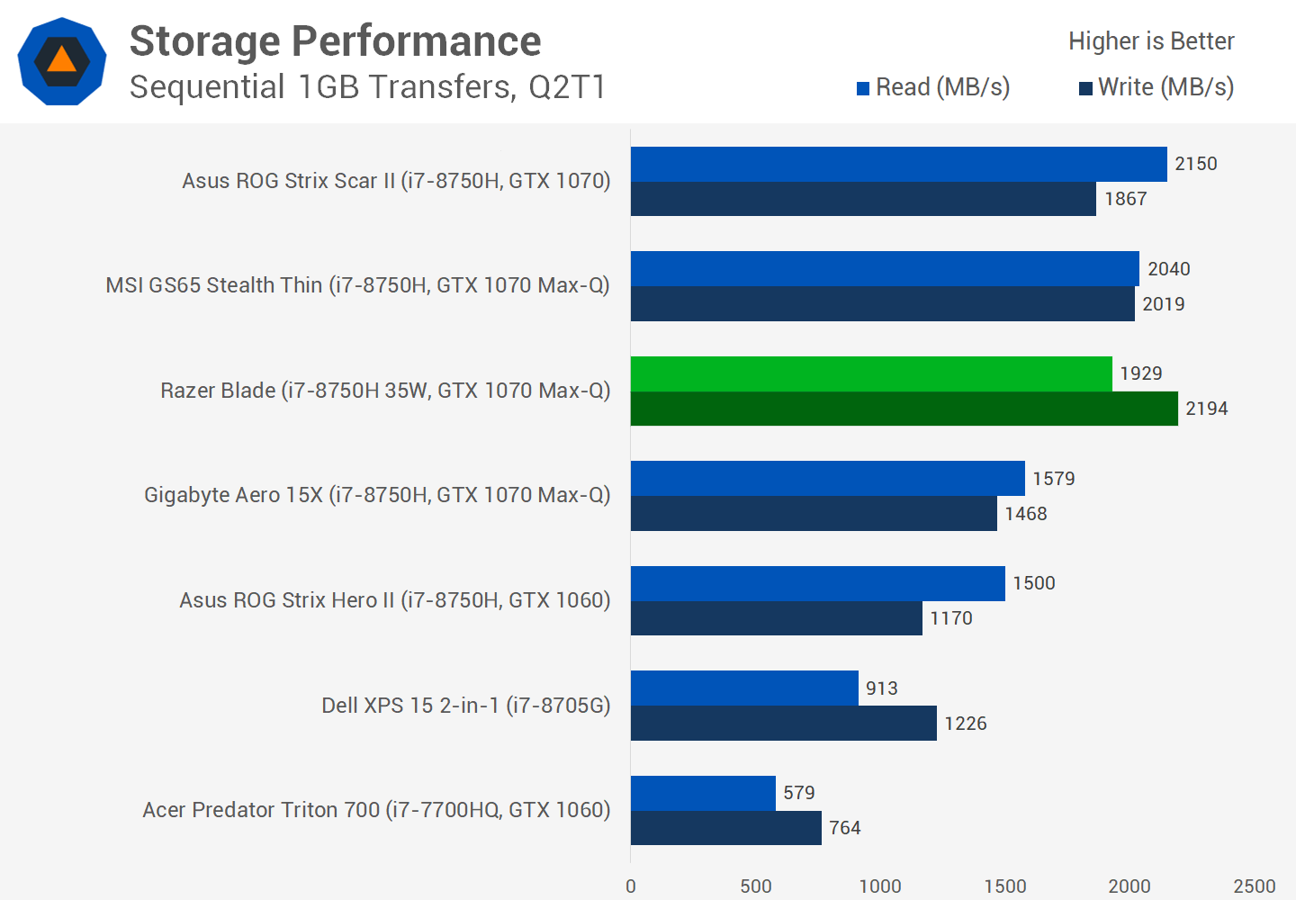 Именно производительность графического процессора делает Razer Blade 15 одним из самых мощных игровых ноутбуков на данный момент, демонстрируя 3DMark Fire Strike результат 14,047. Но, как ни странно, Asus ROG GL504 Scar II снова одерживает победу над Blade с результатом 14 413, несмотря на то, что он только качает старый GTX 1070 GPU.