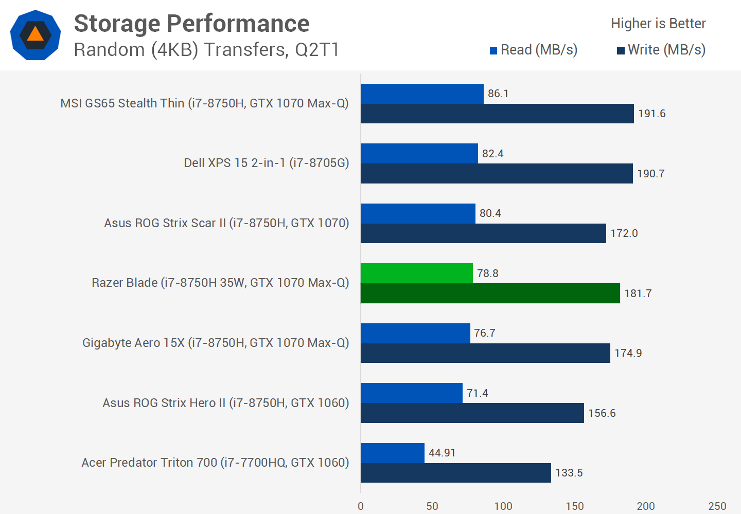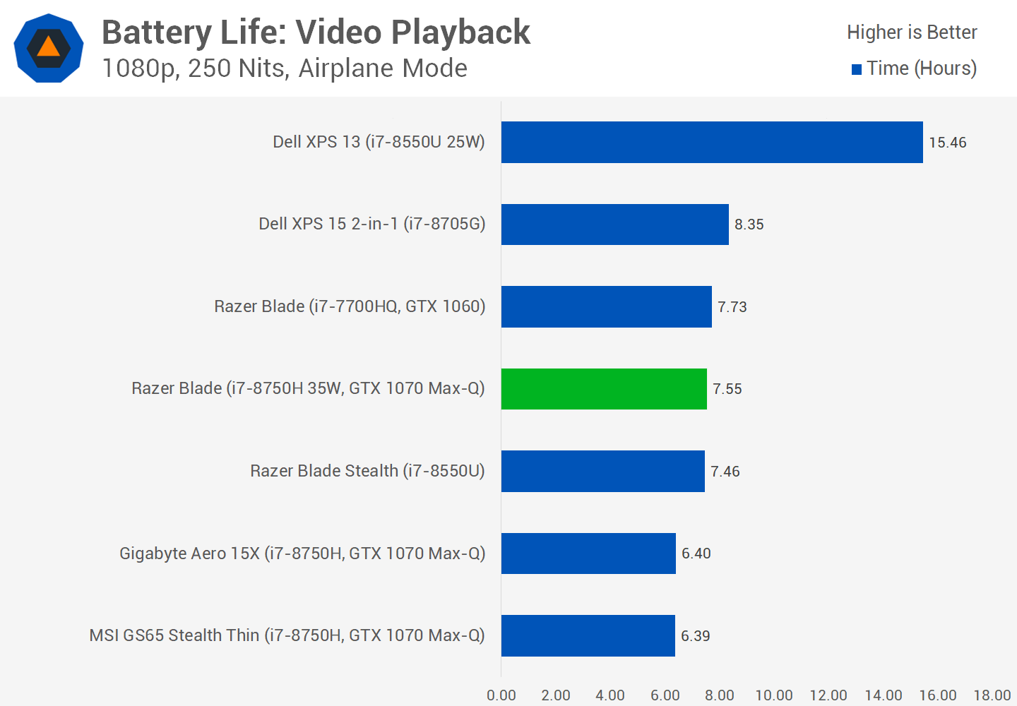 Его игровая производительность также очень хорошая, совместимая с нашей системой отсчета с идентичными характеристиками в нашем тестовом наборе игр. Учитывая что Blade теперь поставляется с шестиядерным процессором и GTX 1070 Max-Q это означает, что он более чем на 25% быстрее в играх по сравнению со старой моделью, что по сути является одним и тем же форм-фактором. Трудно жаловаться на это.