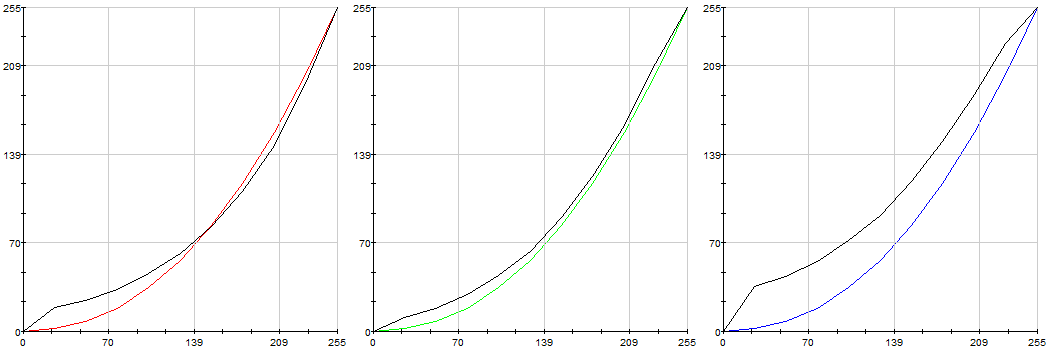 Гамма-кривые дисплея до калибровки (черные линии) в сравнении с идеальными (цветные линии)