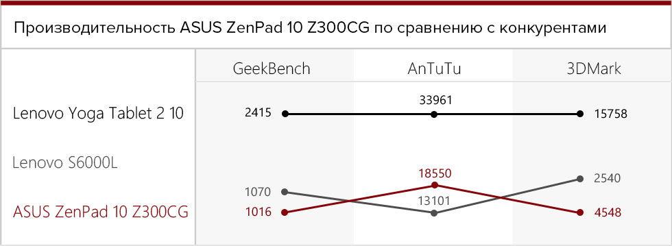 Планшет существует в трёх модификациях: Z300C (только Wi-Fi), Z300CG (3G + Wi-Fi), Z300CL (LTE + Wi-Fi). Самым мощным процессором обладает последний из них. Первых два оснащены очень слабым железом, имеющим низкую производительность. С уверенностью можно заявить, что качественные игры и мощные программы ему точно не под силу.