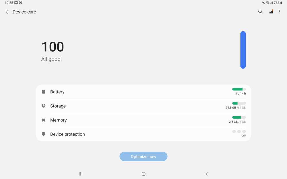 Батарейка в планшете что надо: Samsung заявляет до 13 часов работы в режиме воспроизведения видео в качестве 720p. Я выставлял яркость на средний уровень и запускал видео на YouTube в максимальном качестве — в таком режиме планшет садился за час на 8-9 %, вполне прилично. По моим ощущениям, одной зарядки хватает на трое, а то и четверо суток, если пользоваться устройством дома по вечерам для просмотра видео или чтения.