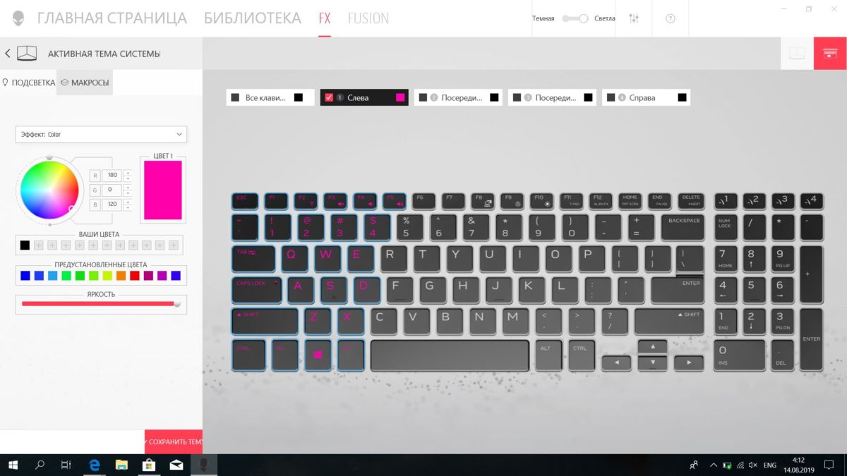 Первое, что бросается в глаза — это подсветка клавиш AlienFX. Это понятие включает в себя и саму физическую подсветку, и программный центр по кастомизации свечения. Рассказывать о всех возможностях этой утилиты не имеет смысла.